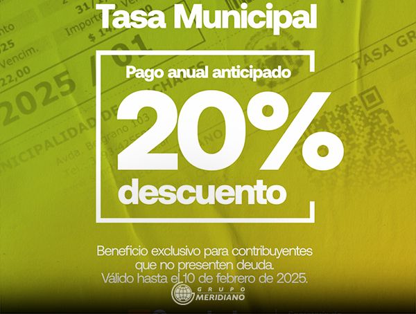 BONIFICACIÓN : abonando las 12 cuotas de la tasa municipal en un solo pago, obtiene un 20% de descuento sobre el monto anualizado y a valor de enero de 2025 (evitando de esta manera futuros aumentos).