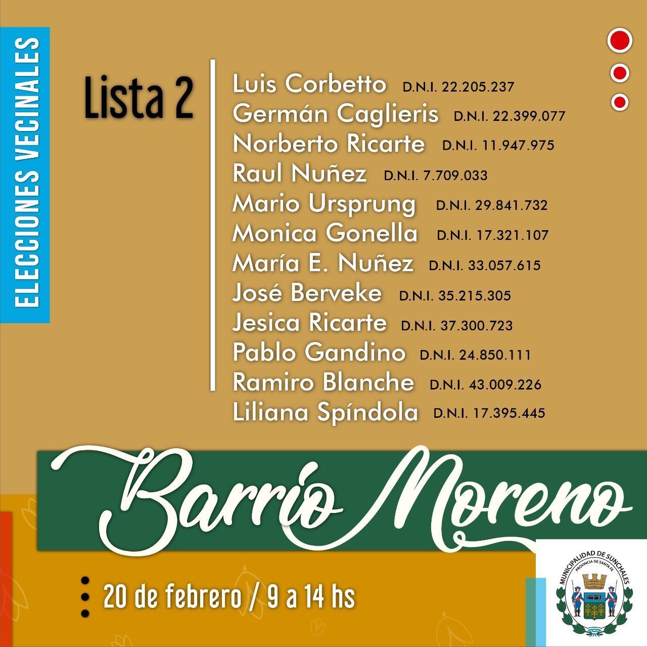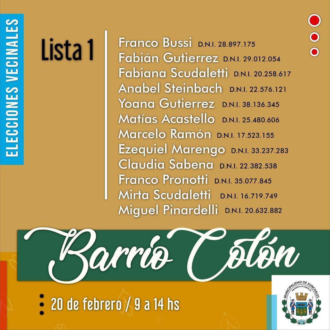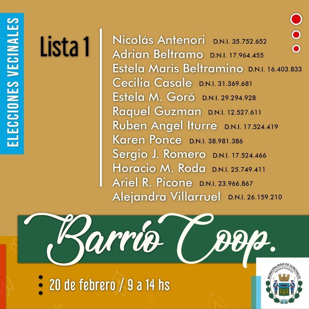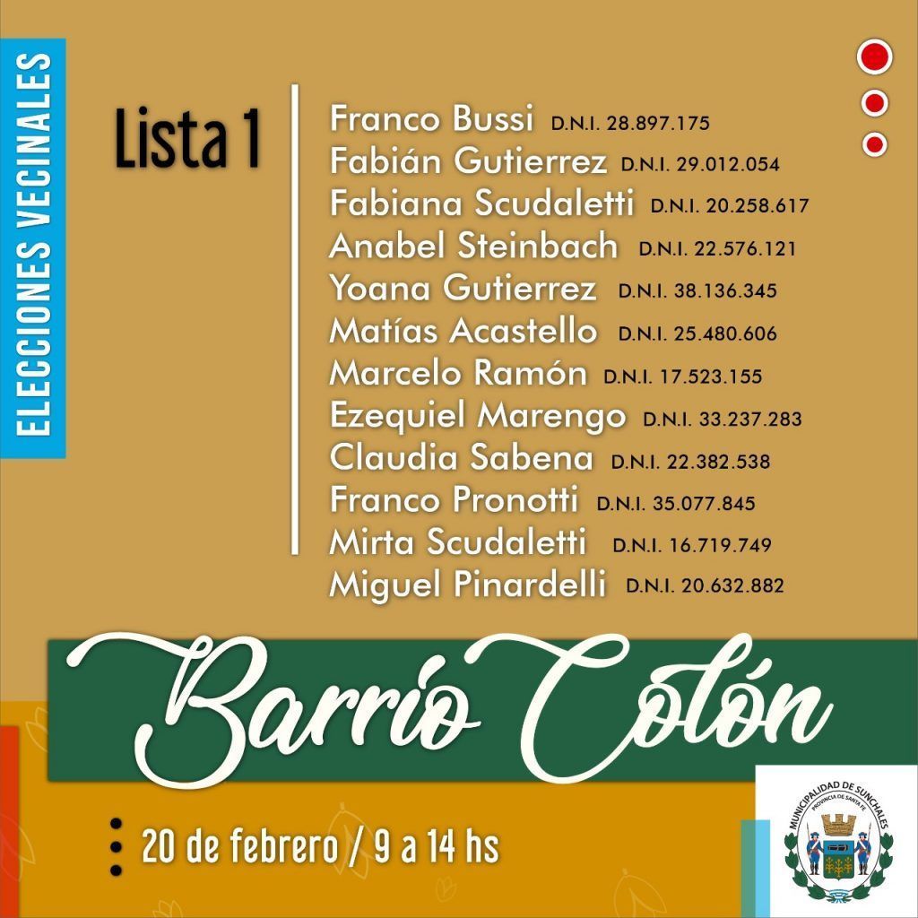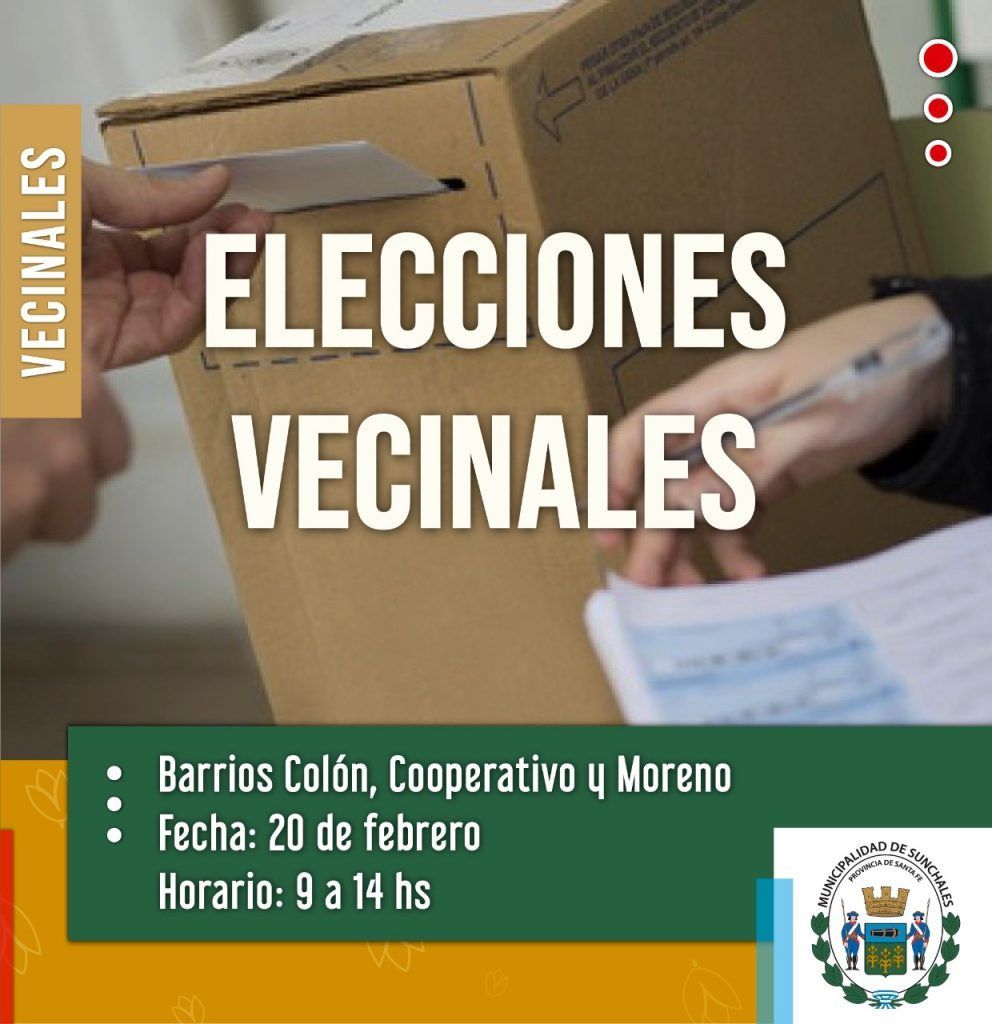 La Municipalidad de Sunchales invita a los ciudadanos a participar de las elecciones vecinales en barrios Colón, Moreno y Cooperativo el próximo 20 de febrero. Los comicios se llevarán a cabo siguiendo los protocolos pertinentes en materia de seguridad sanitaria.