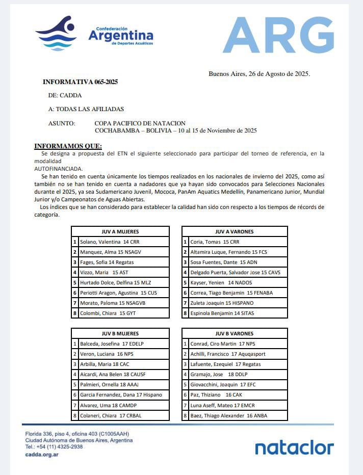 La joven nadadora sunchalense Agustina Periotti, de 15 años, fue convocada para formar parte de la Selección Argentina de Natación y representará al país en la competencia que se realizará en Cochabamba, Bolivia. Agustina pertenece al Club Atlético Unión y se encuentra bajo la dirección del profesor Hernán Bergesio.