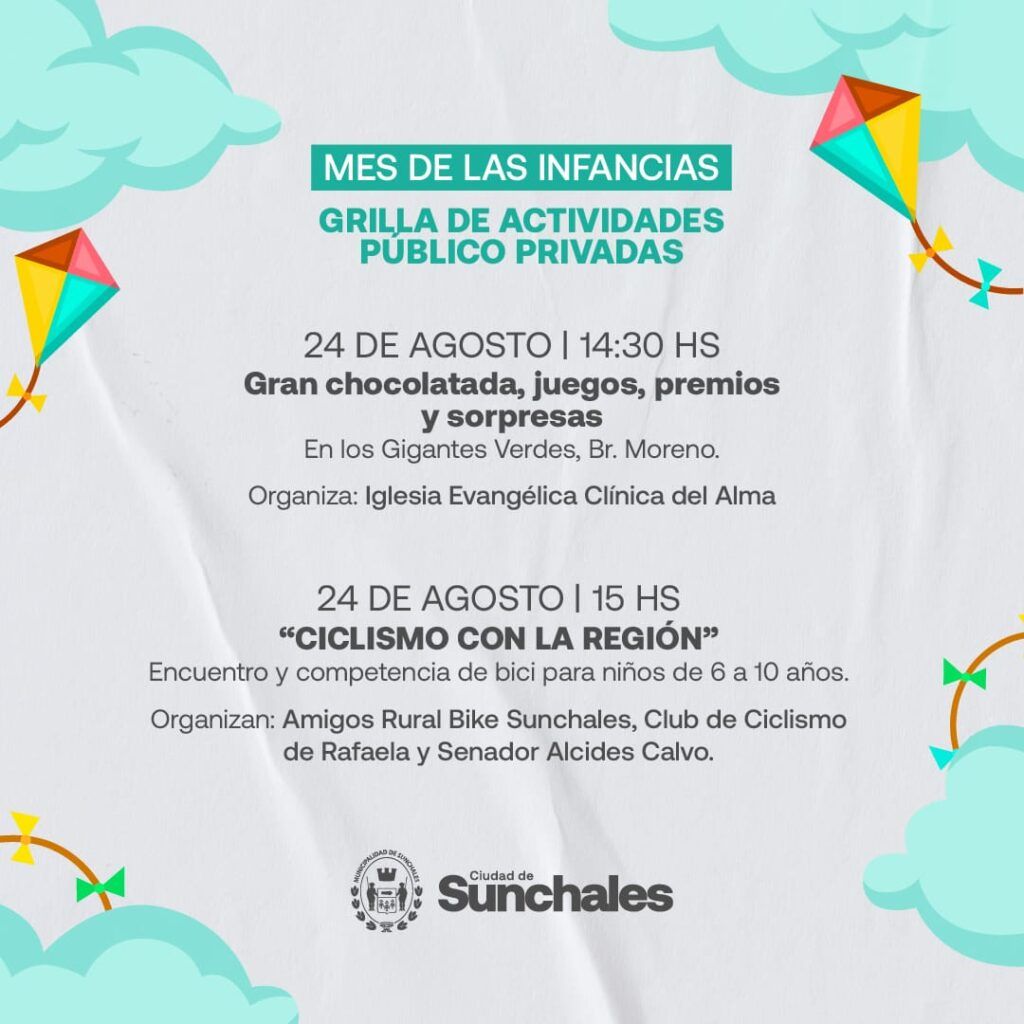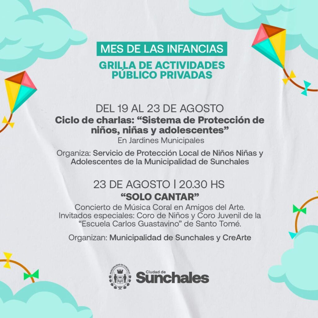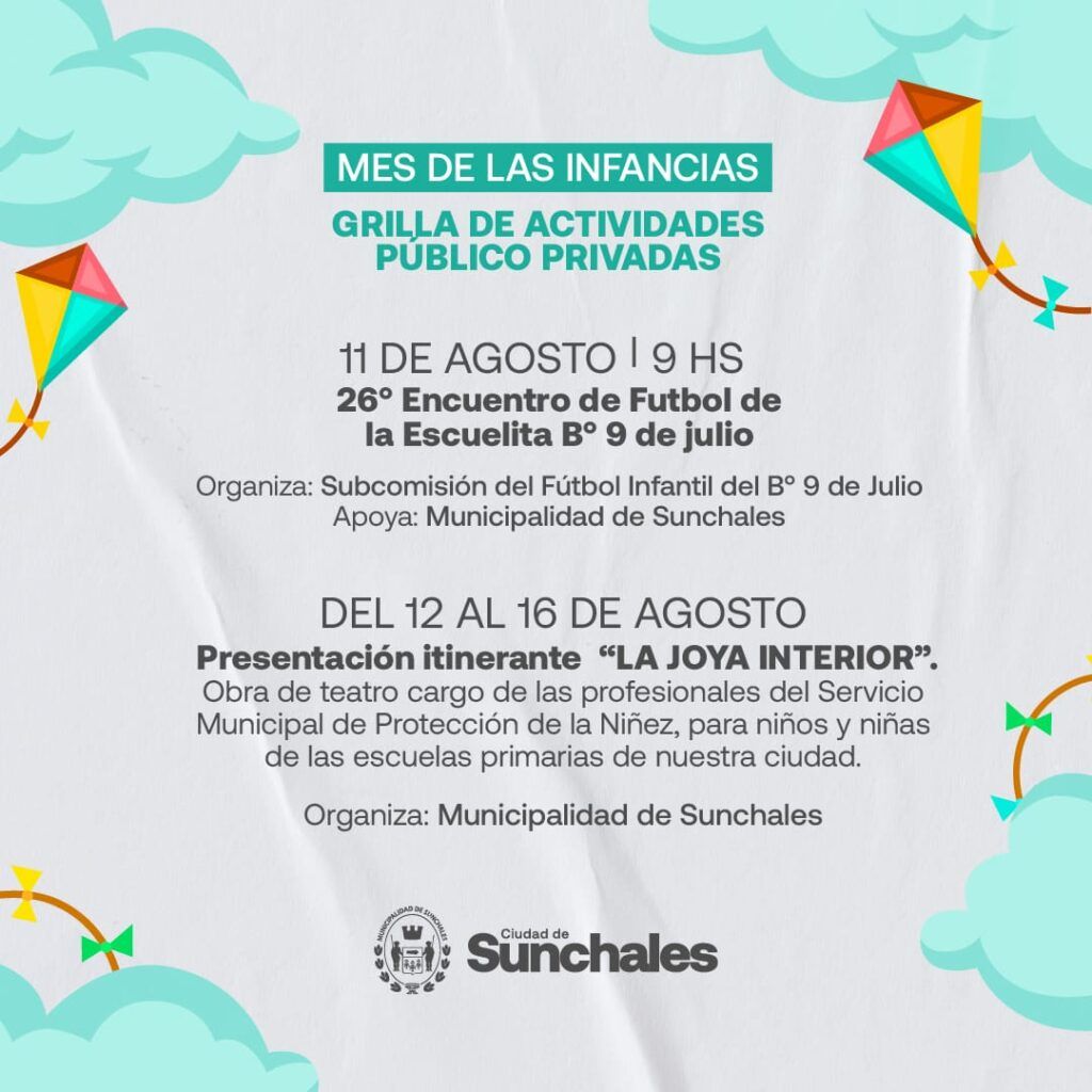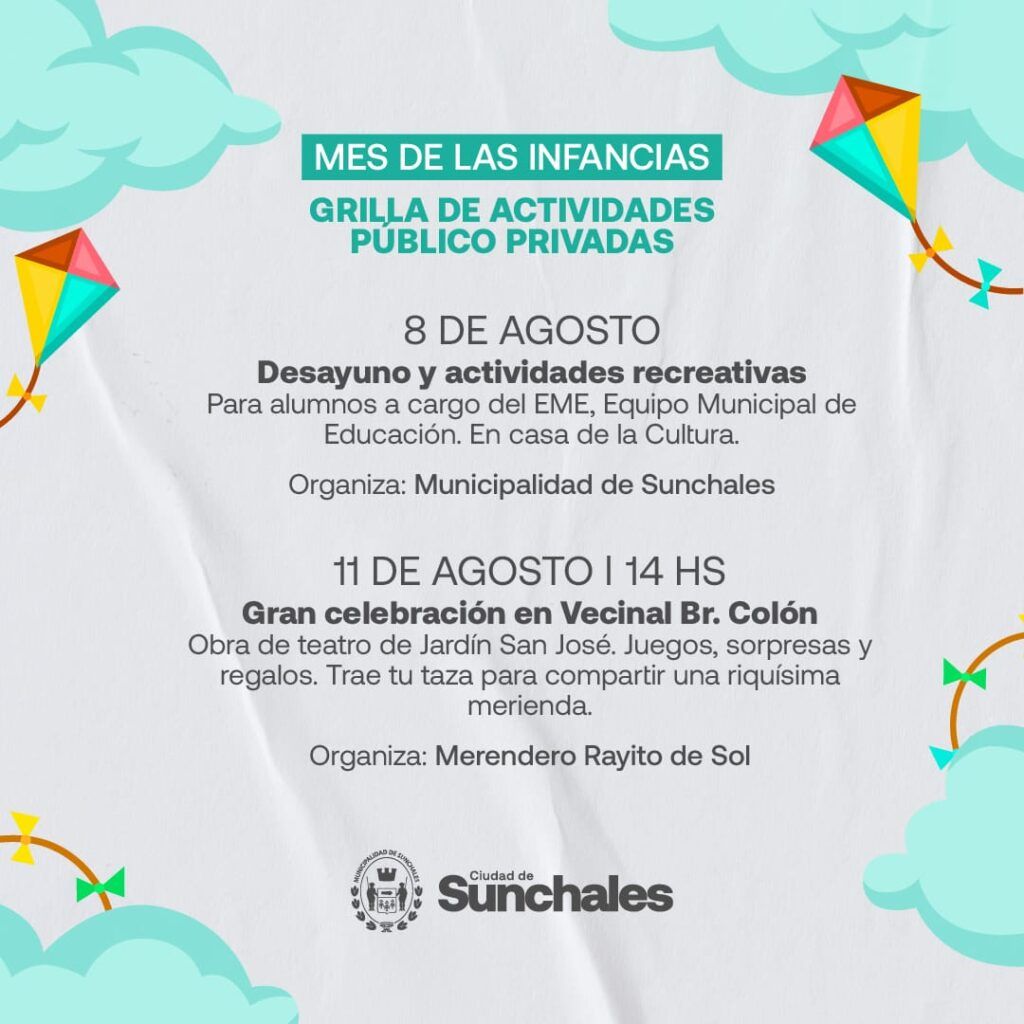 Con la coordinación de las Subsecretarías de Promoción de Derechos a cargo de Elisa Riera y de Cultura y Educación dirigida por Jose Galli se ha organizado esta amplia y destacada programación que se incluye en la GRILLA DE ACTIVIDADES PÚBLICAS-PRIVADAS para el gran festejo durante todo agosto “Mes de las Infancias".