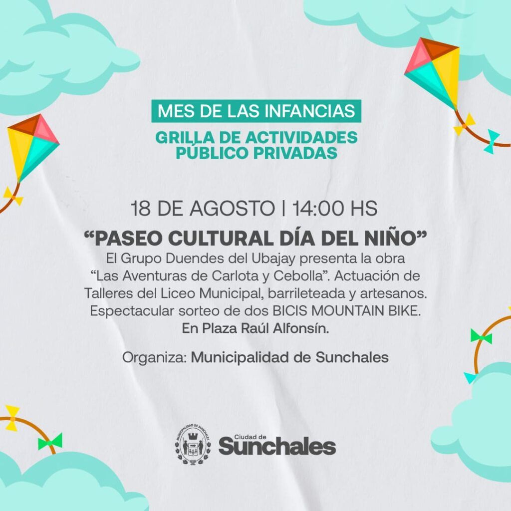 Domingo 18 de agosto, 14:00 hs. “PASEO CULTURAL DÍA DEL NIÑO”. En Plaza Raúl Alfonsín. El Grupo Duendes del Ubajay presenta la obra “Las Aventuras de Carlota y Cebolla”. Actuación de Talleres del Liceo Municipal, Barrileteada, artesanos. Espectacular sorteo de dos BICIS MOUNTAIN BIKE.