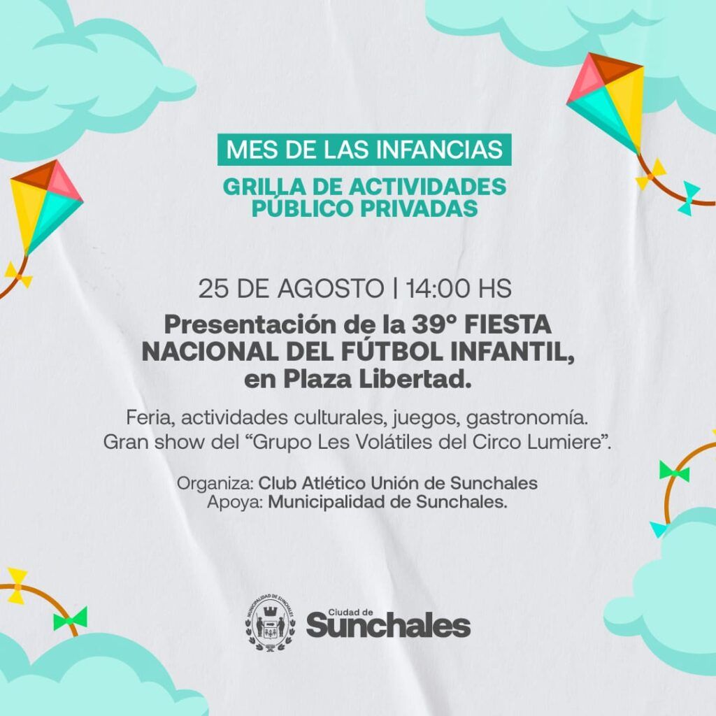 Domingo 25 de agosto, 14:00 hs. – Presentación de la 39° FIESTA NACIONAL DEL FÚTBOL INFANTIL, en Plaza Libertad. Feria, actividades recreativas, juegos, gastronomía. Gran Show del “Grupo Les Volátiles del Circo Lumiere”.