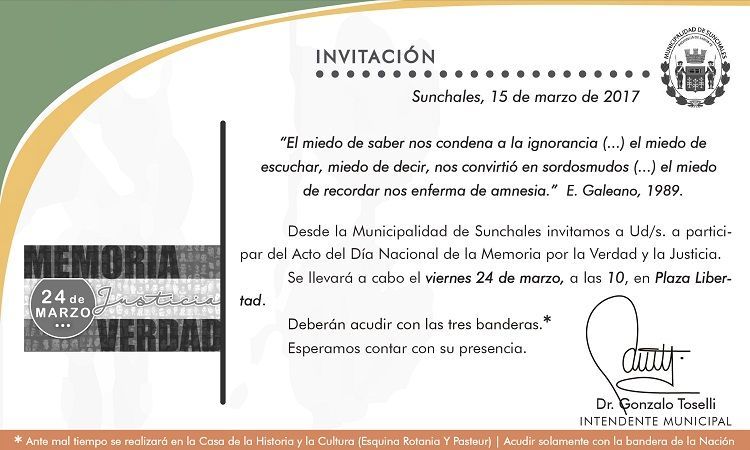 La Municipalidad de Sunchales invita a la comunidad a la conmemoración del Día Nacional de la Memoria por la Verdad y la Justicia, a realizarse el viernes 24 de marzo. Será desde las 10, en Plaza Libertad.