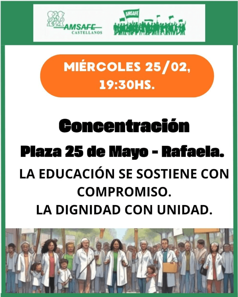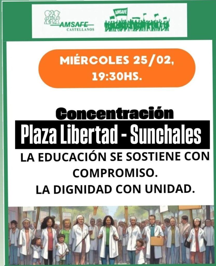 El gremio docente AMSAFE Castellanos convoca a una concentración en nuestra ciudad de Sunchales, en Plaza Libertad este miércoles 25 a las 19:30hs en el marco del conflicto salarial que atraviesa la provincia de Santa Fe. El reclamo se enmarca en la discusión paritaria con el gobierno provincial, que recientemente presentó una propuesta salarial que, según las autoridades, ubicaría a Santa Fe entre las jurisdicciones con mejores salarios docentes del país.