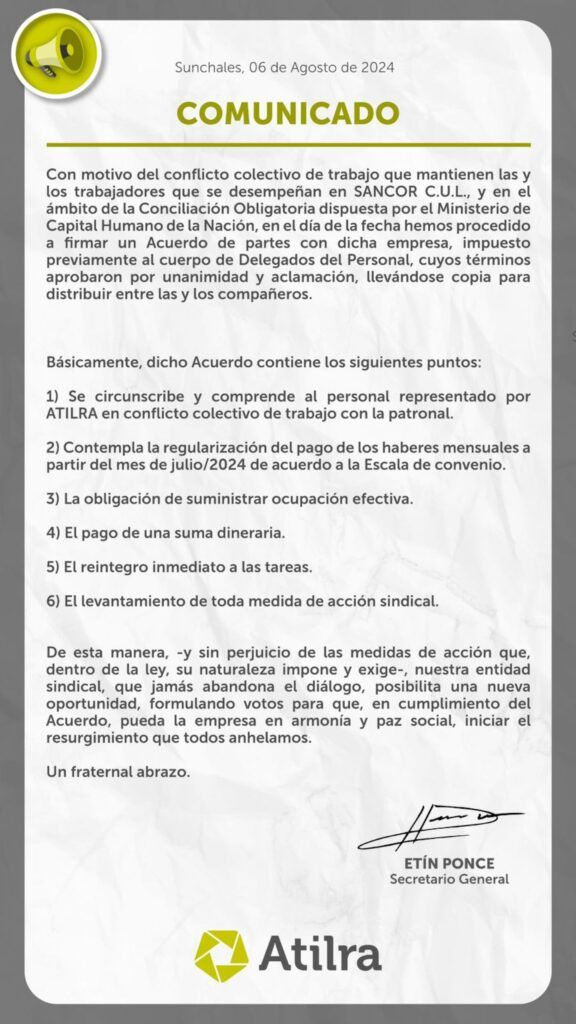 En el comunicado, el secretario general de ATILRA, Héctor “Etín” Ponce, afirmó que la entidad sindical facilitó “una nueva oportunidad para resolver el conflicto” con SanCor, a pesar de las medidas de acción que la situación podría exigir dentro del marco legal.