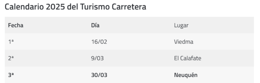Viedma volverá a ser sede de la apertura del torneo el 15 y 16 de febrero y la 2ª fecha se disputará el 8 y 9 de marzo en El Calafate. En tanto que, la 3ª cita del certamen, será el 29 y 30 de marzo en Centenario (Neuquén), fin de semana en el que la “máxima” compartirá escenario con el novel Turismo Carretera 2000.