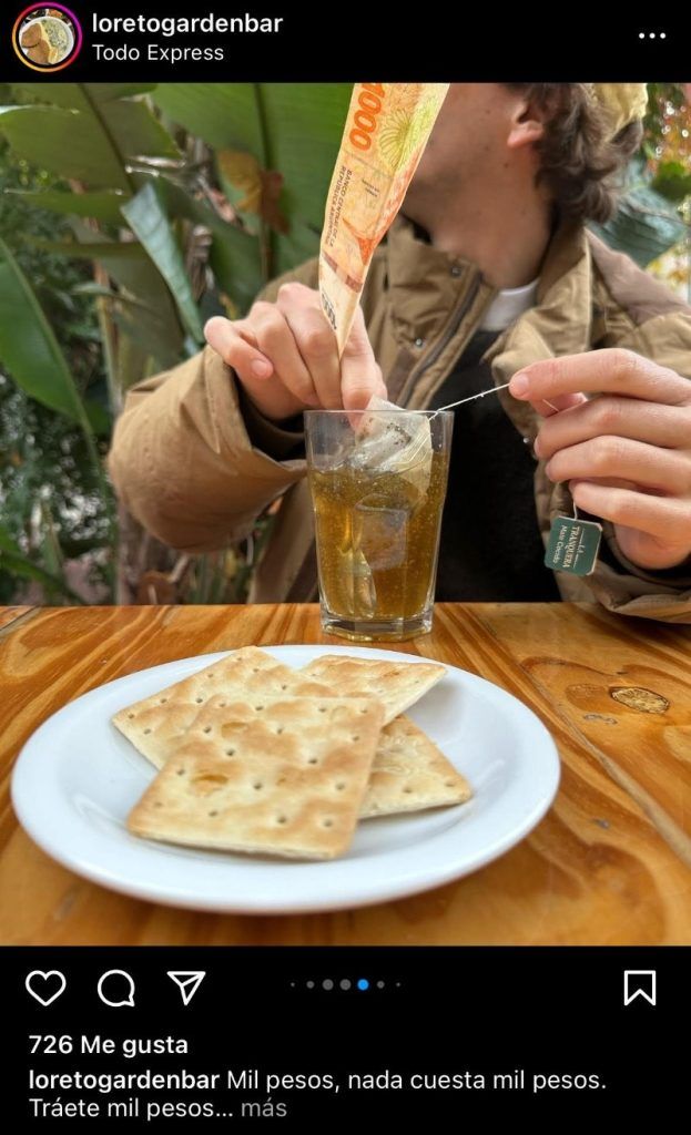 La publicación del local gastronómico tiene la frase "Nada cuesta mil pesos" con la foto de un hombre tomando la infusión con las crackers en un platito.
