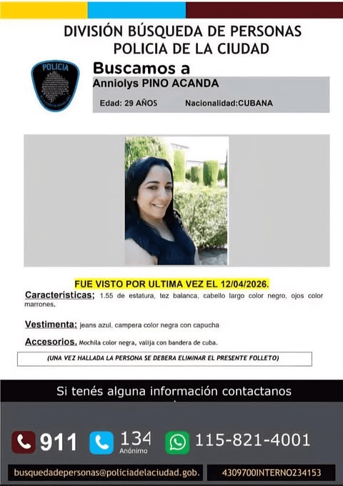 Se solicita colaboración para dar con el paradero de Anniolys Pino Acanda, médica cubana de 29 años, quien habría vivido o trabajado en Sunchales. Viajó a Buenos Aires por trámites y no se tienen noticias de ella desde la tarde del 12 de abril.