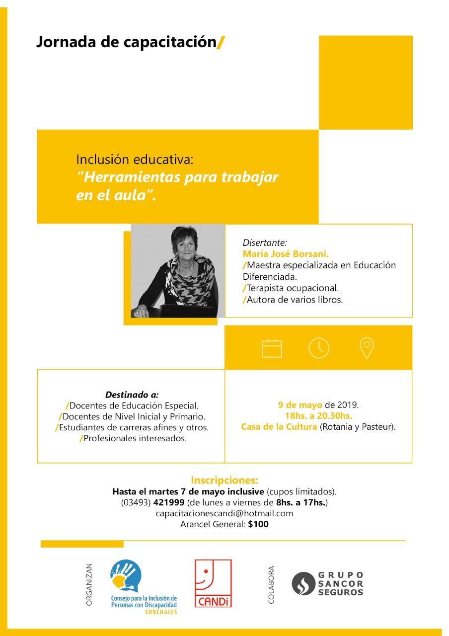 El Consejo para la Inclusión de Personas con Discapacidad y la Escuela Especial N° 1281 “CANDi” invitan a todos los interesados a participar de la jornada de capacitación sobre inclusión educativa “Herramientas para trabajar en el aula” a cargo de la disertante María José Borsani