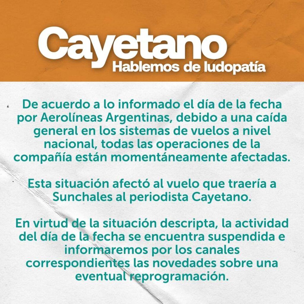 De acuerdo a lo informado el día de la fecha por Aerolíneas Argentinas, debido a una caída general en los sistemas de vuelos a nivel nacional, todas las operaciones de la compañía están momentáneamente afectadas. Esta situación afectó al vuelo que traería a Sunchales al periodista Cayetano.