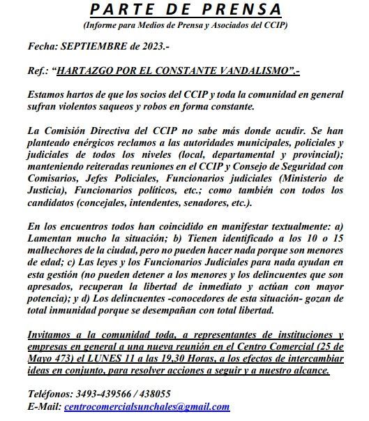 Locales Centro Comercial: "Hartazgo por el constante vandalismo" ·7 septiembre, 2023 ·Lisandro D'Angelis Reenviar Twittear Compartir El CCIP elaboró un comunicado en donde se expresa el enojo por los "violentos saqueos y robos". Por ende, convoca a toda la comunidad de Sunchales a una nueva reunión en su sede. La misma se desarrollará el próximo lunes 11 a las 19:30 horas. Noticias relacionadas Recuperación y arreglo de calles y caminos en toda la ciudad 16 abril, 2026 Operativos de atención de ANSES en todo el país: cómo será en Sunchales 14 abril, 2026 Nueva edición de Bioferia y Compostaje 14 abril, 2026 Enrico: “El Gobierno de Pullaro está construyendo en Sunchales un nuevo hospital cuatro veces más grande que el actual” 13 abril, 2026 El "Hospital Almícar Gorosito" incorpora un nuevo respirador portátil 10 abril, 2026 Taller "Mi futuro laboral" 9 abril, 2026 Navegación de entradas Siguiente noticiaAnterior noticia