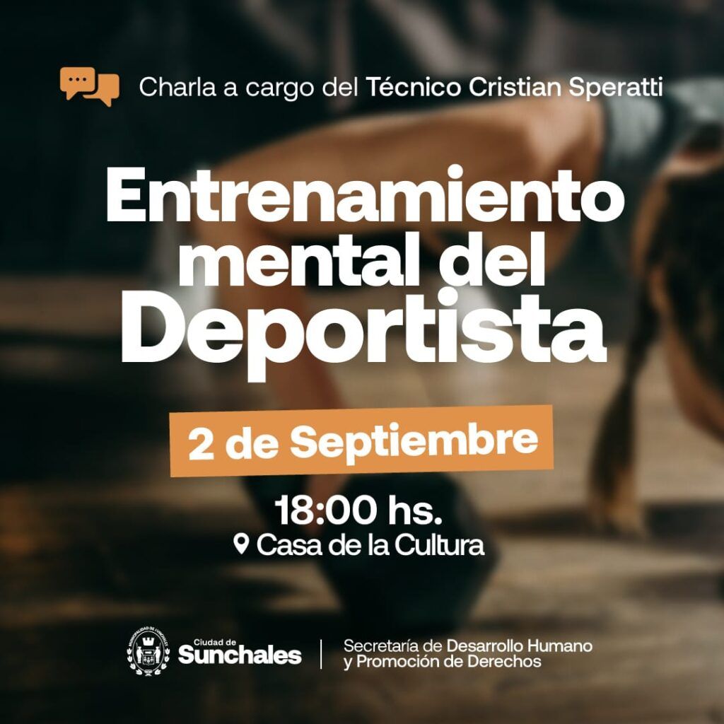 La Secretaría de Desarrollo Humano y Promoción de Derechos, de la Municipalidad de Sunchales, invita a profesores de las diferentes disciplinas, monitores, cuerpo técnico, directivos a la charla: “Entrenamiento mental del Deportista”, a cargo del Téc. Cristian Speratti, de la ciudad de Santa Fe.
