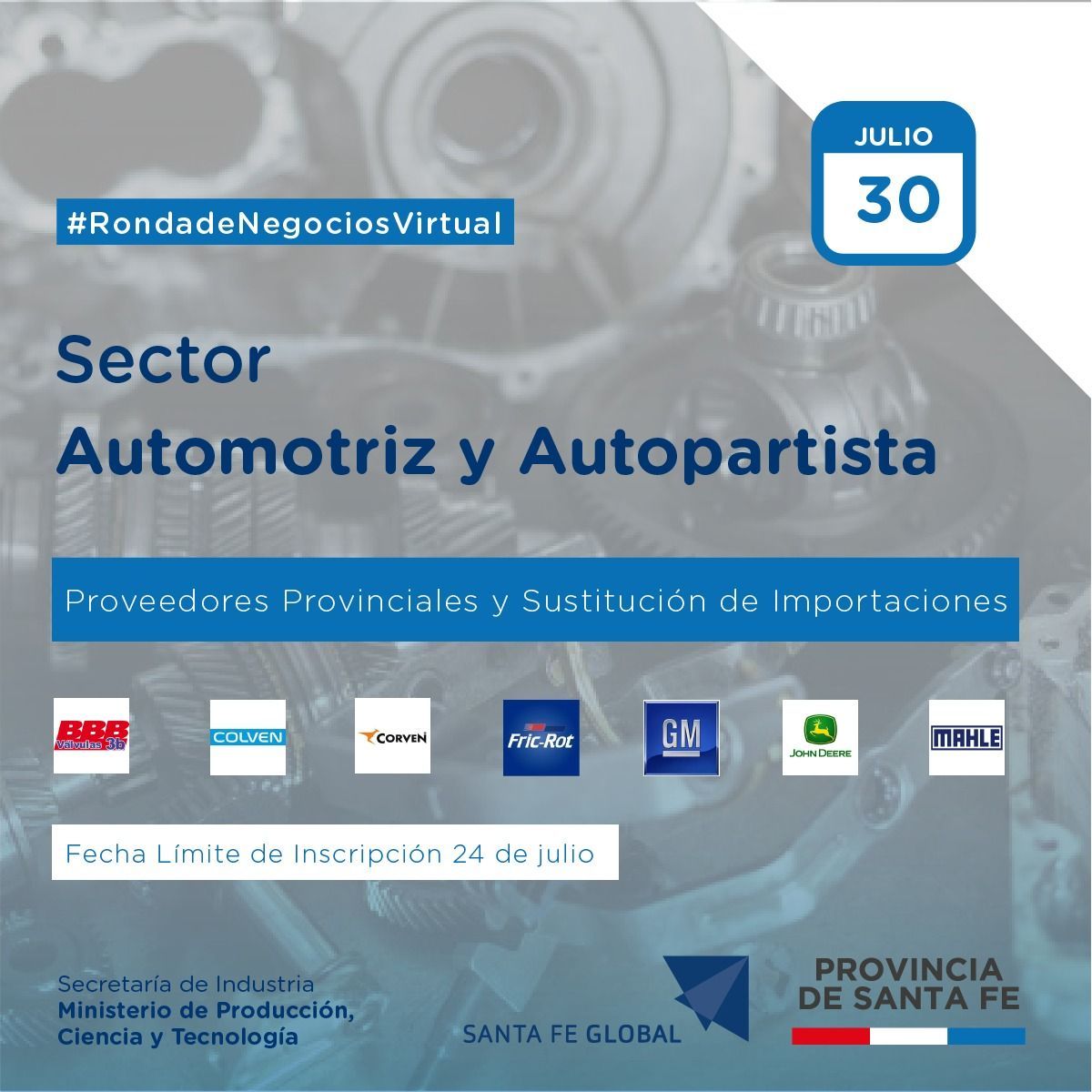 Una inciativa de La Agencia Santa Fe Global en conjunto con la Secretaría de Industria del Ministerio de Producción, Ciencia y Tecnología de Santa Fe.Se trata de la Primera Ronda de Negocios Virtual del Sector Automotriz y Autopartista Provincial.