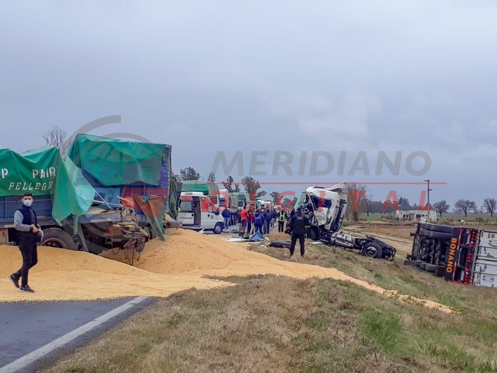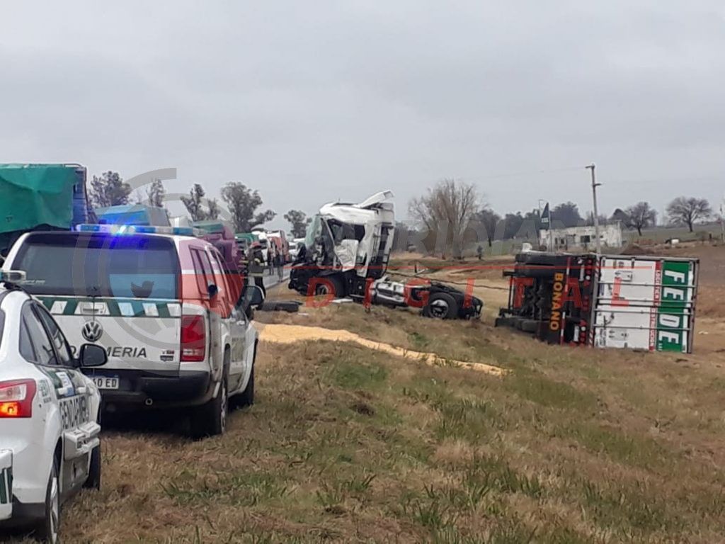 De acuerdo a las primeras informaciones se trataría de un choque frontal entre un camión de carga de granos y otro que sería frigorífico, donde uno de los conductores habría perdido la vida.