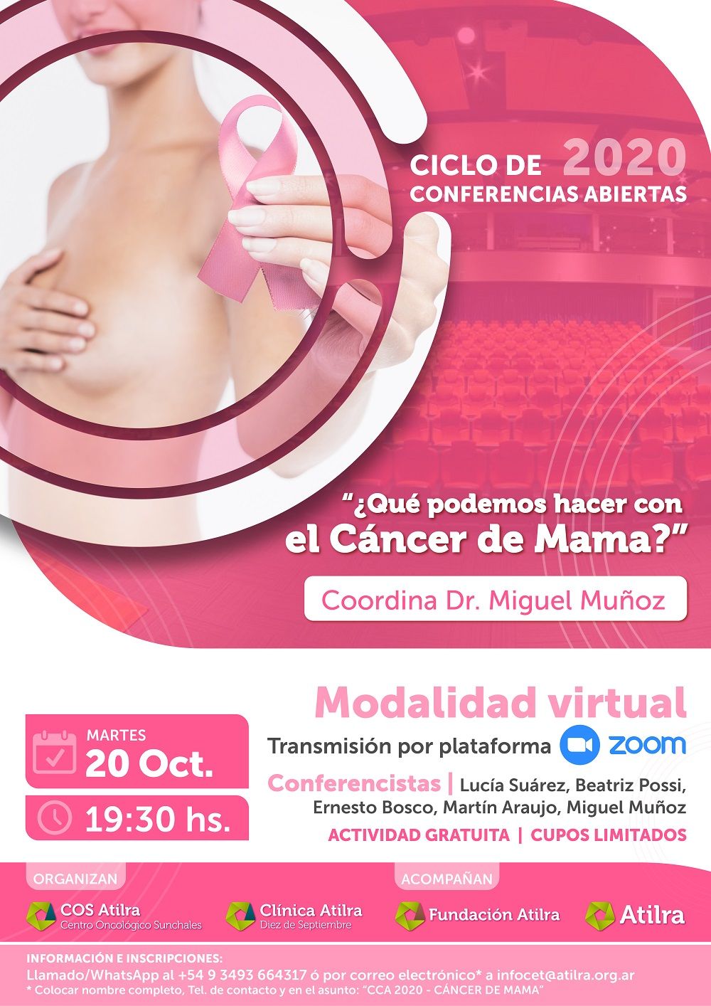 Información e Inscripciones: Llamado/WhatsApp al +54 9 3493 664317 ó por correo electrónico* a infocet@atilra.org.ar * Colocar nombre completo, Tel. de contacto y en el asunto: “CCA 2020 – CÁNCER DE MAMA” #ClínicaAtilra #COSAtilra #Atilra #FundaciónAtilra #QuedateEnCasa