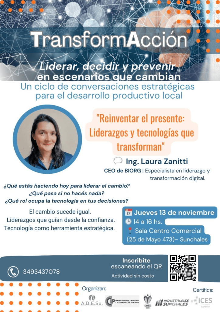 El jueves 13 de noviembre se llevarán a cabo un ciclo de conversaciones estratégicas para el desarrollo productivo local, un espacio pensado para quienes desean diseñar el futuro desde hoy. La Ing. Laura Zanitti, especialista en liderazgo y transformación digital, abordará la temática a partir de preguntas disparadoras.