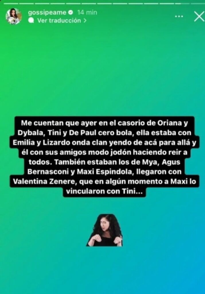 “Me cuentan que ayer, en el casorio de Oriana y Dybala, Tini y De Paul cero bola. Ella estaba con Emilia (Mernes) y Lizardo (Ponce) onda clan yendo de acá para allá, y él con sus amigos, modo jodón haciendo reír a todos”, indicó la instagramer.