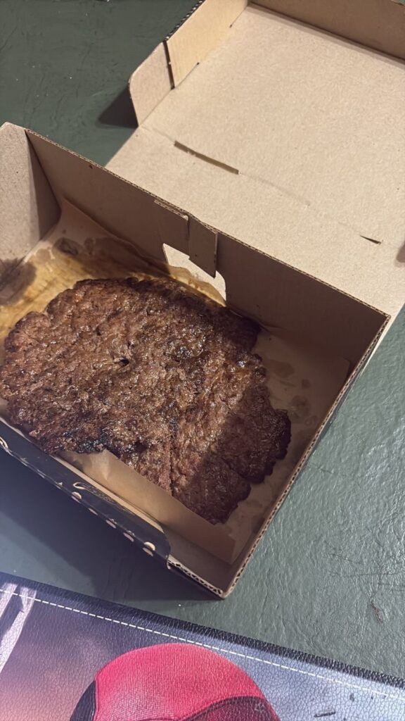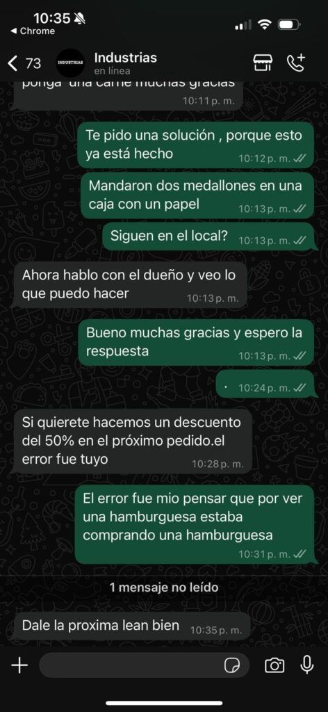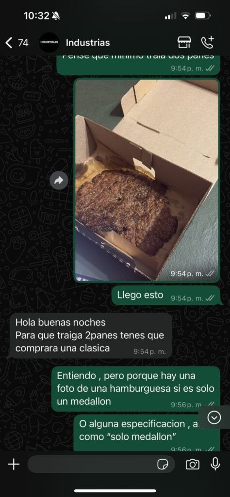 La joven recibió dos hamburguesas solas, sin pan ni ningún tipo de aderezo, cuando su intención era tener el menú completo, tal y como se lo conoce, pero a la hora de hablar con la rotisería, desde el local comercial le explicaron que su pedido era correcto y lo había malinterpratado.