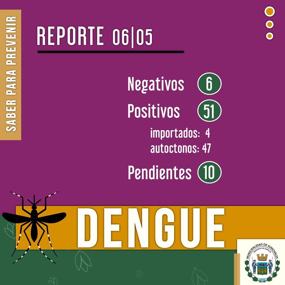 ➡️ 51 casos positivos por Dengue (4 importados y 47 autóctonos),➡️ 6 negativos y ➡️10 casos pendientes de resultado. En relación a esto, ℹ️semanalmente brindaremos reportes acerca de la evolución de la enfermedad.