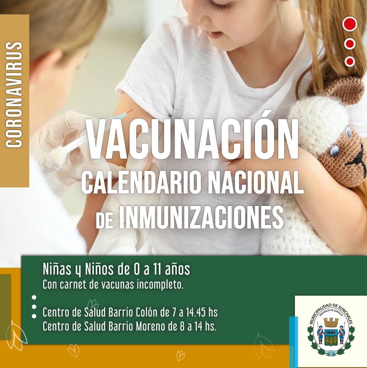 La Municipalidad de Sunchales informa a toda la comunidad que los Vacunatorios de la localidad continúan abiertos. Todas aquellas familias cuyos niños y niñas tengan entre 0 y 11 años y no posean su carnet de Inmunización al día, lo puede completar asistiendo a: