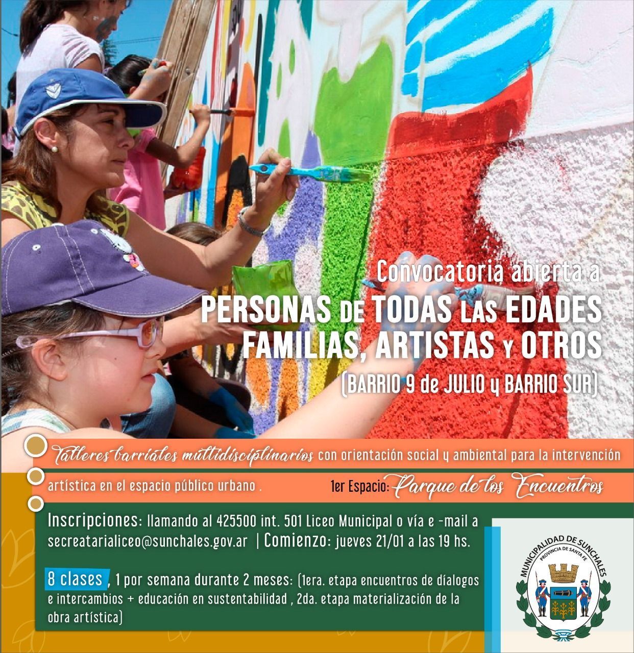 La Municipalidad de Sunchales anuncia la convocatoria de “AULAS TALLERES” dirigida a personas de todas las edades. Artistas y público en general de los barrios 9 de Julio y Sur, que deseen ser parte de un taller multidisciplinario con orientación social y ambiental, cuyo fin último es una intervención artística en el espacio público urbano.