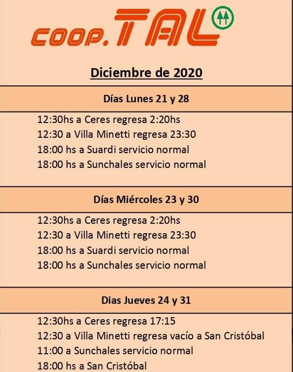 Servicios de Cooperativa TAL en Diciembre – Desde Santa Fe
