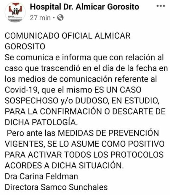 Y para completar la escena, desde el Hospital Almicar Gorosito, unos 45 minutos más tarde de haber confirmado como positivo el caso, la Directora del mismo, la Dra. Carina Feldman puso en duda el caso y firmó la siguiente publicación en la fanpage de Facebook. Lo llamativo es que en la misma se habla de que "trascendió en los medios…" y más que un trascendido fue una confirmación por parte de ella misma y el intendente de la ciudad.