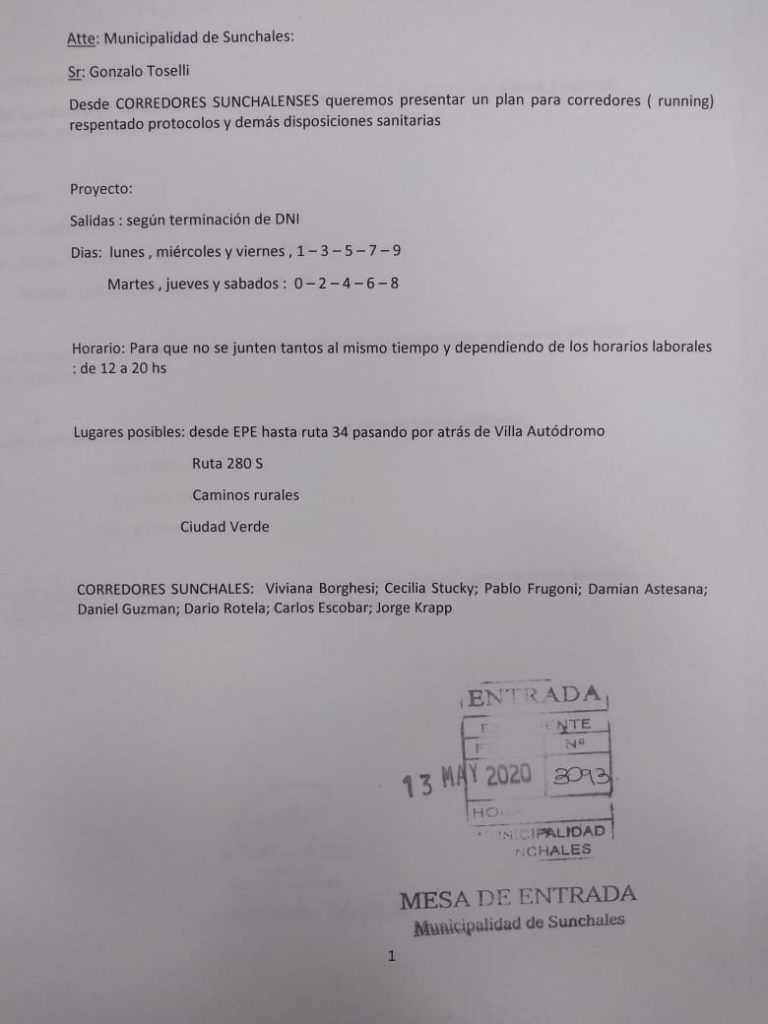Con la formalidad que merece el caso, desde la organización "Corredores Sunchalenses" hicieron llegar al palacio municipal un nota dirigida al intendente Gonzalo Toselli donde se le presenta un plan para corredores.