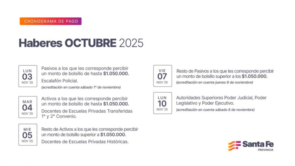 El Gobierno Provincial, a través del Ministerio de Economía, informó que los haberes del mes de octubre se percibirán a partir del lunes 3 de noviembre y concluirán el viernes 7. Los pasivos provinciales a los que les corresponde percibir un monto de bolsillo de hasta $1.050.000 y el escalafón Policial y Penitenciario, tendrán el dinero depositado en sus cuentas el sábado 1.