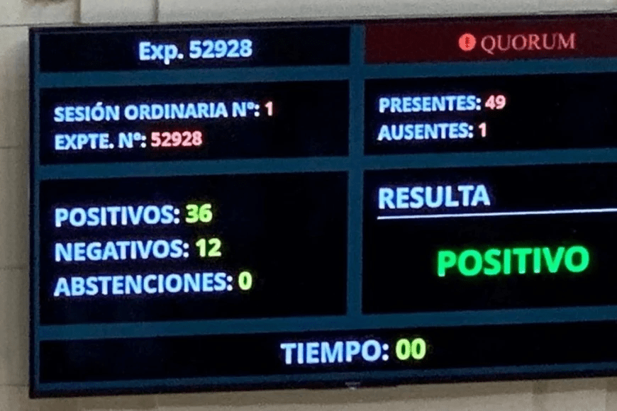 La votación se produjo a las 2:07 y resultó de la siguiente manera: 37 positivos (36 de las bancas y uno de la presidenta), 12 negativos y 0 abstenciones.