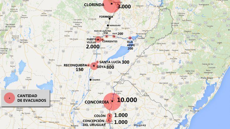 El gobernador de Entre Ríos, Gustavo Bordet, advirtió que es probable que el río Uruguay siga creciendo hasta el domingo, de allí que se estima que la cantidad de evacuados en Concordia se eleve al menos al doble. La mitad de los 10 mil inundados fueron trasladados a centros de evacuación, mientras que el resto se guarecieron en casas de familiares o amigos. "Esto es algo inédito en los últimos 50 años", manifestó el mandatario provincial y rescató que si bien la situación en esta ciudad "es complicada", el panorama "tiende a mejorar" temporalmente por "el respiro" que generó el clima en las últimas horas ante el cese de lluvias.