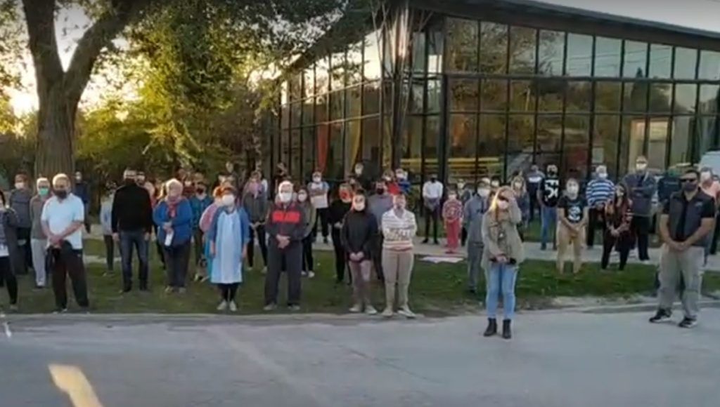 LA GRAN CONCENTRACIÓN DE DIÓ EN EL MONUMENTO AL COOPERATIVISMO, DONDE SE LEYÓ EL PETITORIO QUE EL DÍA LUNES SERÁN ENTREGADO AL INTENDENTE GONZALO TOSELLI Y LUEGO SE ENTONARON LAS ESTROFAS DEL HIMNO NACIONAL ARGENTINO.