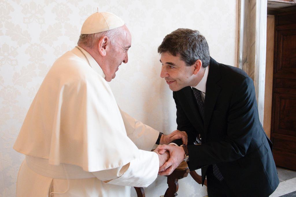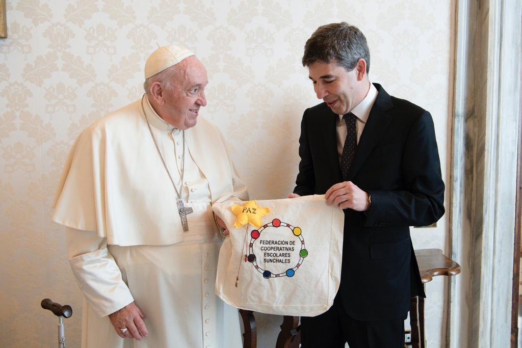 En la ciudad del Vaticano, Alejandro Simón compartió con el Sumo Pontífice las acciones que lleva adelante la Fundación Grupo Sancor Seguros, especialmente lo realizado en materia de consolidación y promoción del Cooperativismo Escolar, tanto en el ámbito de la ciudad de Sunchales como a nivel nacional y transnacional.