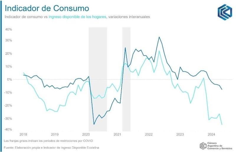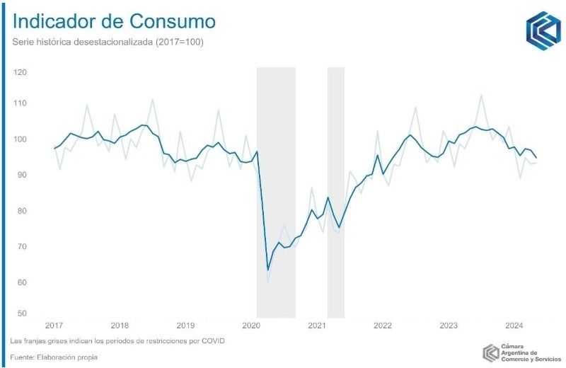 En los primeros cinco meses del año, el Indicador de Consumo (IC) que mide dicha entidad acumuló una caída de 4,3% en la comparación interanual, "marcando un profundo deterioro en el consumo llegando a mediados del año", apunta el informe.