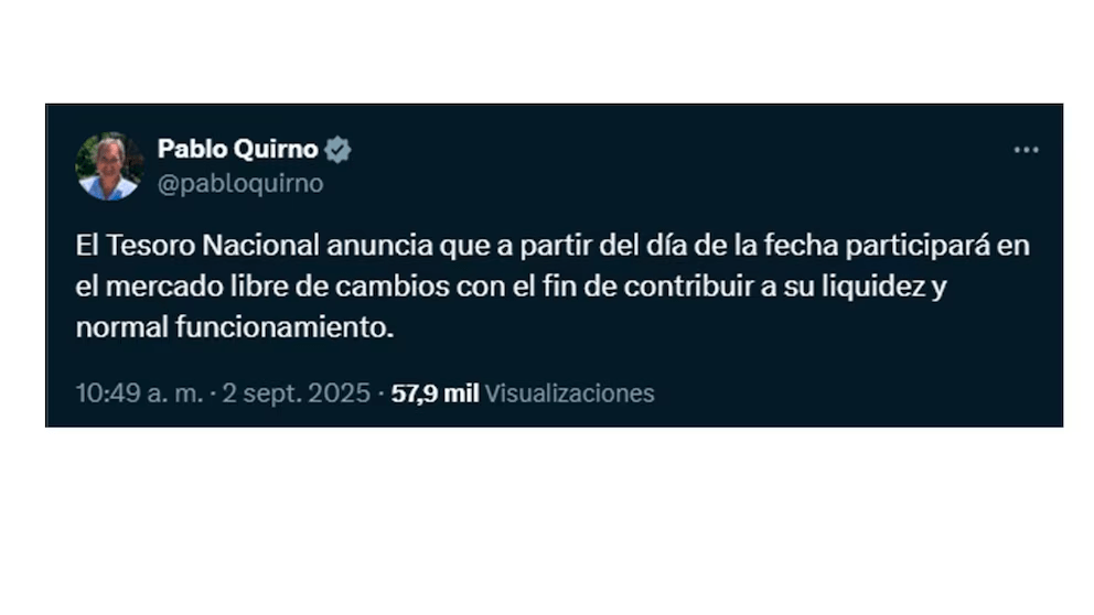 “El Tesoro Nacional anuncia que a partir del día de la fecha participará en el mercado libre de cambios con el fin de contribuir a su liquidez y normal funcionamiento”, comunicó Quirno a través de su cuenta de X. El posteo fue replicado por Javier Milei y todo el equipo económico. En la mesa chica de la Presidente confirman que la medida prevé ser temporal y no extenderse en el mediano y largo plazo. “Es una decisión más coyuntural de tiempos de elecciones”, ratifican. En el Gobierno consideran preciso que para las nacionales el tipo de cambio y la inflación se mantengan estables para incrementar la posición de La Libertad Avanza de ganar las elecciones.