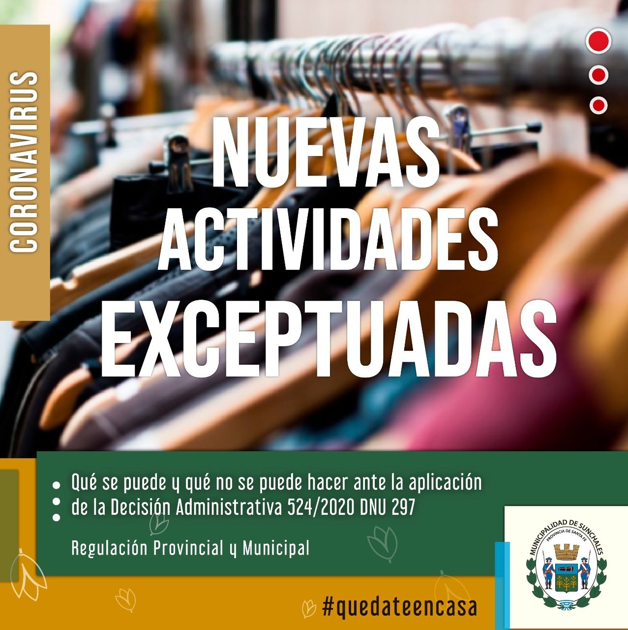 La Municipalidad de Sunchales informa sobre el funcionamiento de once actividades exceptuadas por la Decisión Administrativa 524 establecido por el Poder Ejecutivo Nacional.