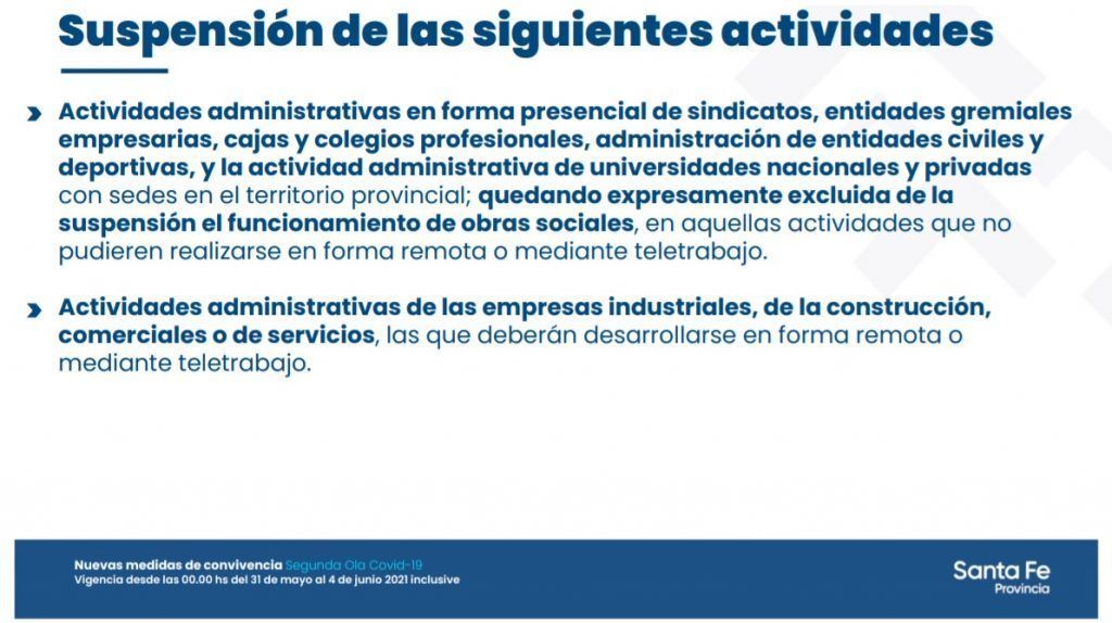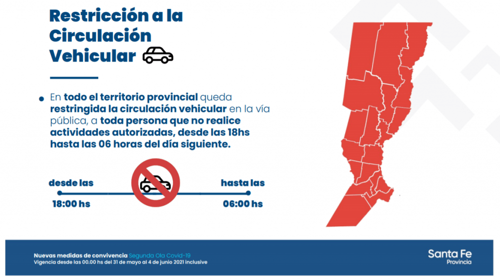 Provinciales El gobierno provincial dio a conocer la estructura de restricciones que regirá desde el lunes 31 de mayo al viernes 4 de junio ·29 mayo, 2021 ·Lisandro D'Angelis Reenviar Twittear Compartir Noticias relacionadas Cada amenaza se paga: Santa Fe comienza a cobrar los operativos en escuelas 28 abril, 2026 Inicia la etapa final del nuevo edificio donde funcionará la escuela técnica de Humberto Primo 27 abril, 2026 Pullaro anunció obras para poner en valor el Acceso Oeste y los parques Garay y del Sur 23 abril, 2026 Santa Fe regresa a la Feria del Libro de Buenos Aires con más de mil títulos 22 abril, 2026 Santa Fe: más de 1,2 millones de toneladas y 860 operaciones en el primer trimestre de 2026 20 abril, 2026 Nuevo modelo vial: provincias podrán administrar rutas nacionales 17 abril, 2026 Navegación de entradas Siguiente noticiaAnterior noticia