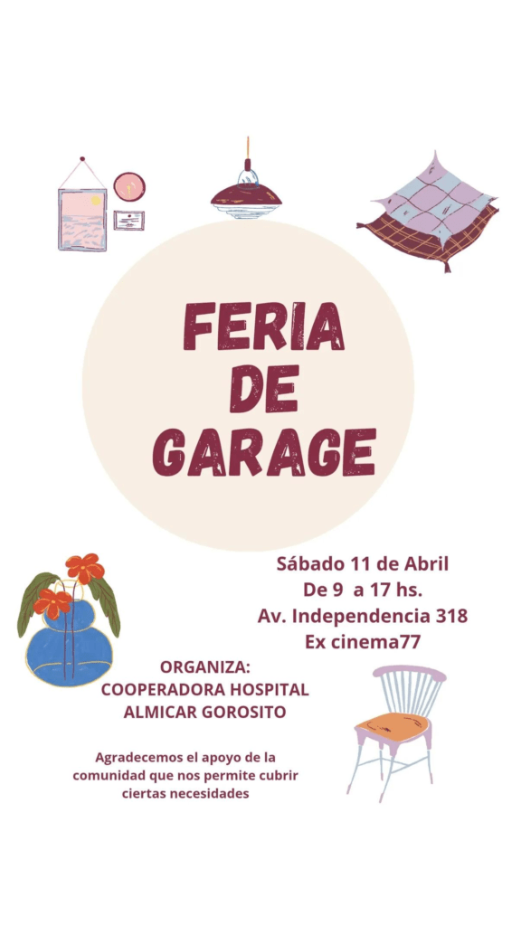 Este sábado 11 de abril, de 9:00 a 17:00hs, se llevará a cabo una feria de garage organizada por la Cooperadora del Hospital Almícar Gorosito. La misma será en Ex cinema 77 (Av. Independencia 318).