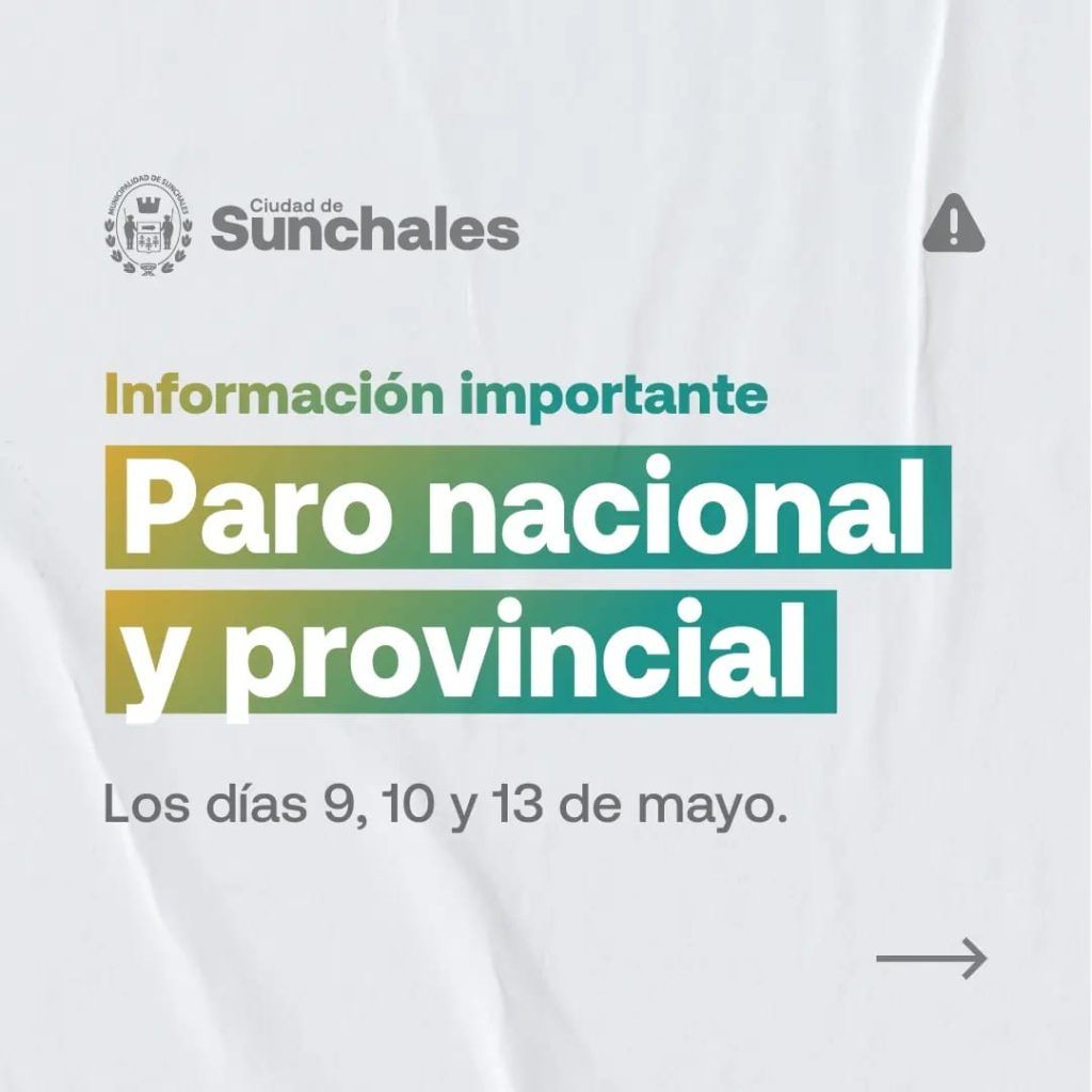 La Municipalidad de Sunchales informa que, debido a los paros Nacional y Provincial, a los cuales adhiere FESTRAM y el Sindicato de Trabajadores Municipales (S.O.E.M) los días jueves 9, viernes 10 y lunes 13 del corriente, no habrá servicios de recolección de residuos. Por lo tanto, se solicita la colaboración ciudadana de no sacar los residuos a la vía pública durante esos días.
