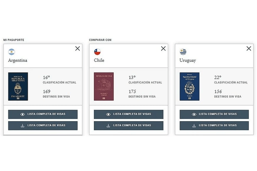 Por su parte, Uruguay aparece algunos escalones más abajo, en el puesto 22, con 156 países habilitados, lo que confirma una leve ventaja del pasaporte argentino frente al uruguayo en términos de movilidad internacional.