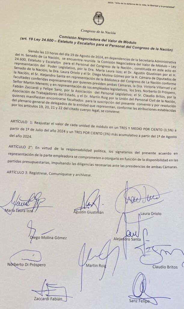 El incremento será de 3,5% sobre los sueldos de julio y otro 3% sobre el monto a percibir en agosto. La dieta de los legisladores de la Cámara alta alcanzará los $9 millones.La suba fue establecida por la Comisión Negociadora paritaria del Parlamento nacional, una mesa que aglutina a la pata sindical que responde a los trabajadores y los representantes de las Cámaras de Diputados y Senadores, que se reunió en las últimas horas y resolvió el aumento.La resolución lleva la firma de las autoridades del Senado, María Laura Izzo, secretaria administrativa, y Agustín Giustinian, secretario parlamentario. Por Diputados Laura Oriolo, secretaria administrativa y Diego Molina Gómez, secretario general de Diputados y los sectores sindicales. Norberto Di Prospero y Fabián Zacardi de parte de la Asociación del Personal Legislativo (APL), Claudio Britos de ATE y Martín Roig de Unión del personal civil de la Nación.