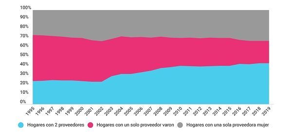 En efecto, los hogares en donde solo el varón aporta a la economía del hogar cayeron de un 52% a un 22% entre 1986 y 2019. Las familias monomarentales, por su parte, pasaron de representar un 8% en 1986 a un 13% del total de familias en 2019, y los hogares donde ambos progenitores sostienen económicamente el hogar se incrementaron de 23% al 40%.