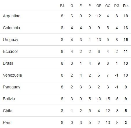 Dos unidades por detrás se encuentra la Selección de Colombia.