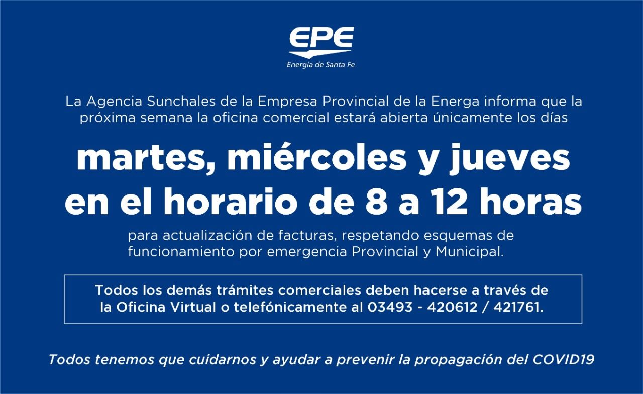 La Agencia Sunchales de la Empresa Provincial de la Energía informa que la próxima semana la oficina comercial estará abierta únicamente los días martes, miércoles y jueves en el horario de 8 a 12 horas para actualización de facturas, respetando esquemas de funcionamiento por emergencia Provincial y Municipal.