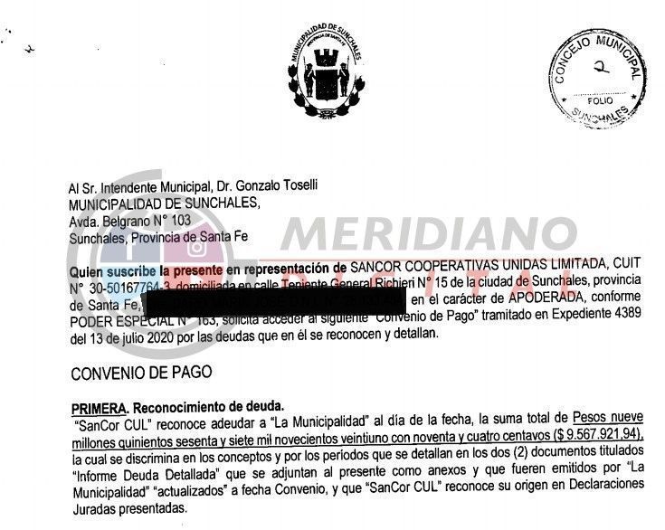 A CONTINUACIÓN REPRODUCIMOS EL TEXTO COMPLETO, tal como le fuera enviado al Intendente de Sunchales, Gonzalo Toselli, por parte de las autoridades de SanCor Cooperativas Unidas Limitadas, reconociendo la deuda millonaria en concepto de DREI y que el Concejo Municipal aprobó durante la mañana de hoy para que el municipio avance en el cobro de la misma.