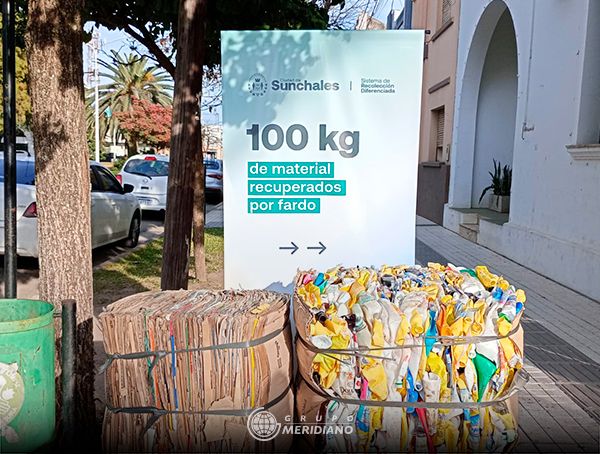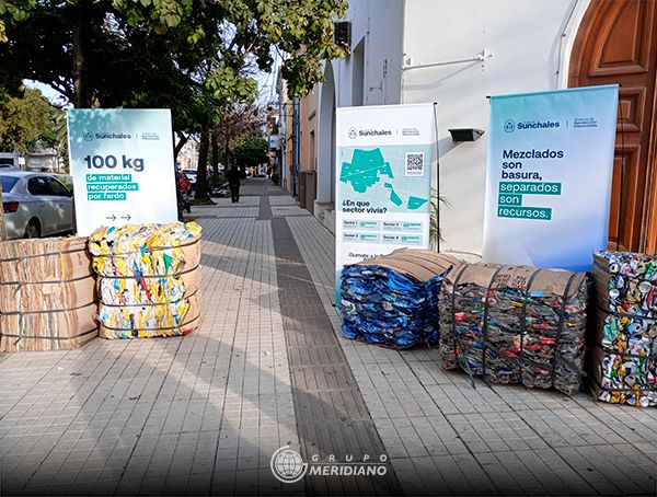 Frente al Palacio Municipal se exhiben fardos de aproximadamente 100 kg cada uno, de cartón de primera, latas y botellas de plásticos y además se brinda información sobre los sectores, días y horarios de la recolección de residuos que se adaptan a las acciones de reciclado.