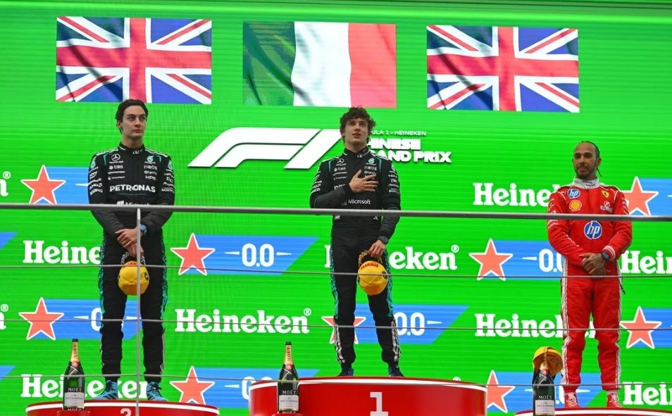 George Russell (2°), "Kimi" Antonelli (1°) y Lewis Hamilton (3°) en el podio.