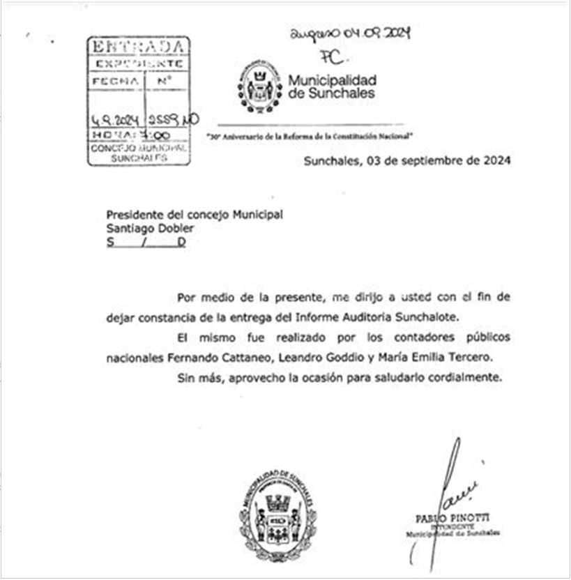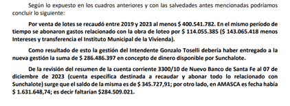 El informe describe diversos inconvenientes y problemas administrativos sucedidos durante la gestión de Toselli, desde simples errores a lo más impactante: faltarían en la cuenta bancaria de “Sunchalote” más de $280 millones de pesos que fueron recaudados de anticipos y cuotas, una parte habrían sido utilizados para pagar gastos generales del municipio y otra parte enviada a cuentas bancarias oficiales no relacionadas al loteo.