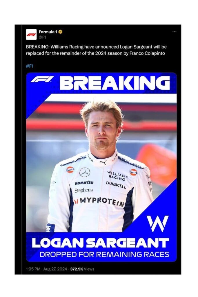 Si bien Sargeant sabía que no iba a tener lugar para el 2025, la idea era que finalizara como parte del equipo en este certamen más allá de las habituales críticas del jefe de Williams, James Vowles, por su mal nivel. Sin embargo, lo que precipitó el movimiento fue un error que el corredor estadounidense de 23 años cometió en la tercera práctica del sábado en el circuito neerlandés de Zandvoort: destrozó su vehículo y no pudieron repararlo para que sea parte de la clasificación de ese mismo día. Y los rumores se encendieron…