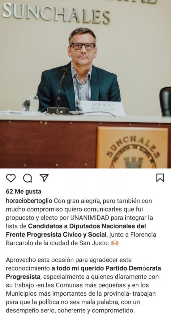 LocalesPolítica Horacio Bertoglio integrará la nómina de candidatos a Diputados Nacionales del Frente Progresista Cívico y Social ·30 mayo, 2021 ·Grupo Meridiano Reenviar Twittear Compartir El propio Presidente del Concejo Municipal de nuestra ciudad comunicó la noticia a través de su cuenta de Instagram. 👇Aquí sus declaraciones👇 Noticias relacionadas Para proteger los fondos de obras que le corresponden a Sunchales, el intendente Pinotti vetó la Ordenanza Nº3257/2025 8 octubre, 2025 Senadores de Santa Fe reciben a cuatro ministros por un préstamo de 50 millones de euros 7 octubre, 2025 Sunchales reconoce a cooperativas y mutuales escolares 6 octubre, 2025 Pablo Farías: “Desde Provincias Unidas queremos llevar al Congreso el estilo de gestión que tenemos en Santa Fe” 6 octubre, 2025 Corte de energía programado para este domingo 5 3 octubre, 2025 La oposición convocó a una sesión en Diputados para reformar los DNU y remover a Espert de Presupuesto 3 octubre, 2025 Navegación de entradas Siguiente noticiaAnterior noticia